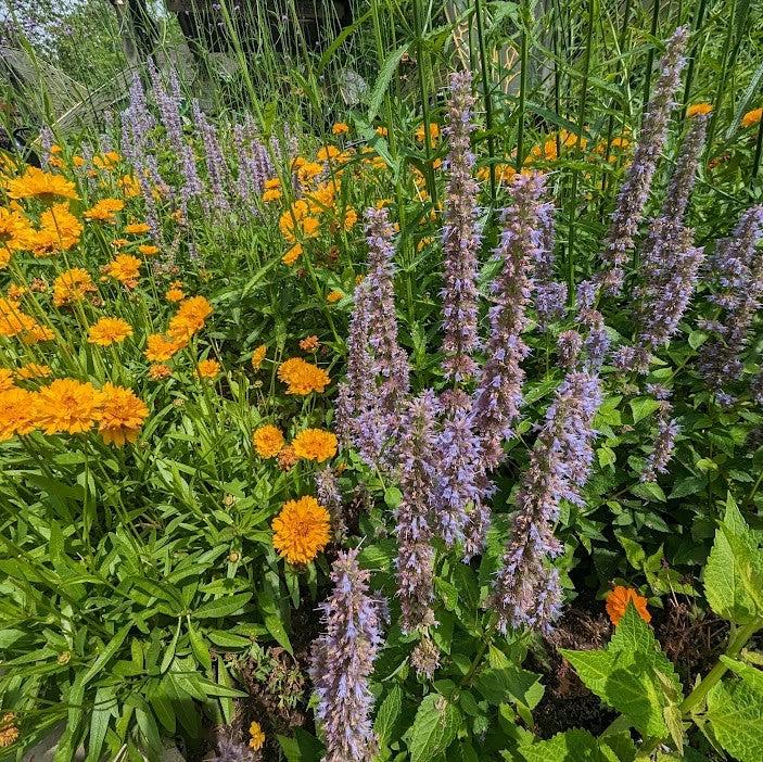 Anise Purple Hyssop is an upright native perennial with semi-woody stems and highly aromatic mint-scented foliage. Short tubular flower spikes top the stems with pale blue, lavender, or purple flowers bloom from midsummer until frost if deadheaded. The papery bracts that remain after the flowers fade can be various colors. Flowers best in full sun and dry to average well-drained soils. Highly attractive to pollinators and butterflies, but avoided by deer.