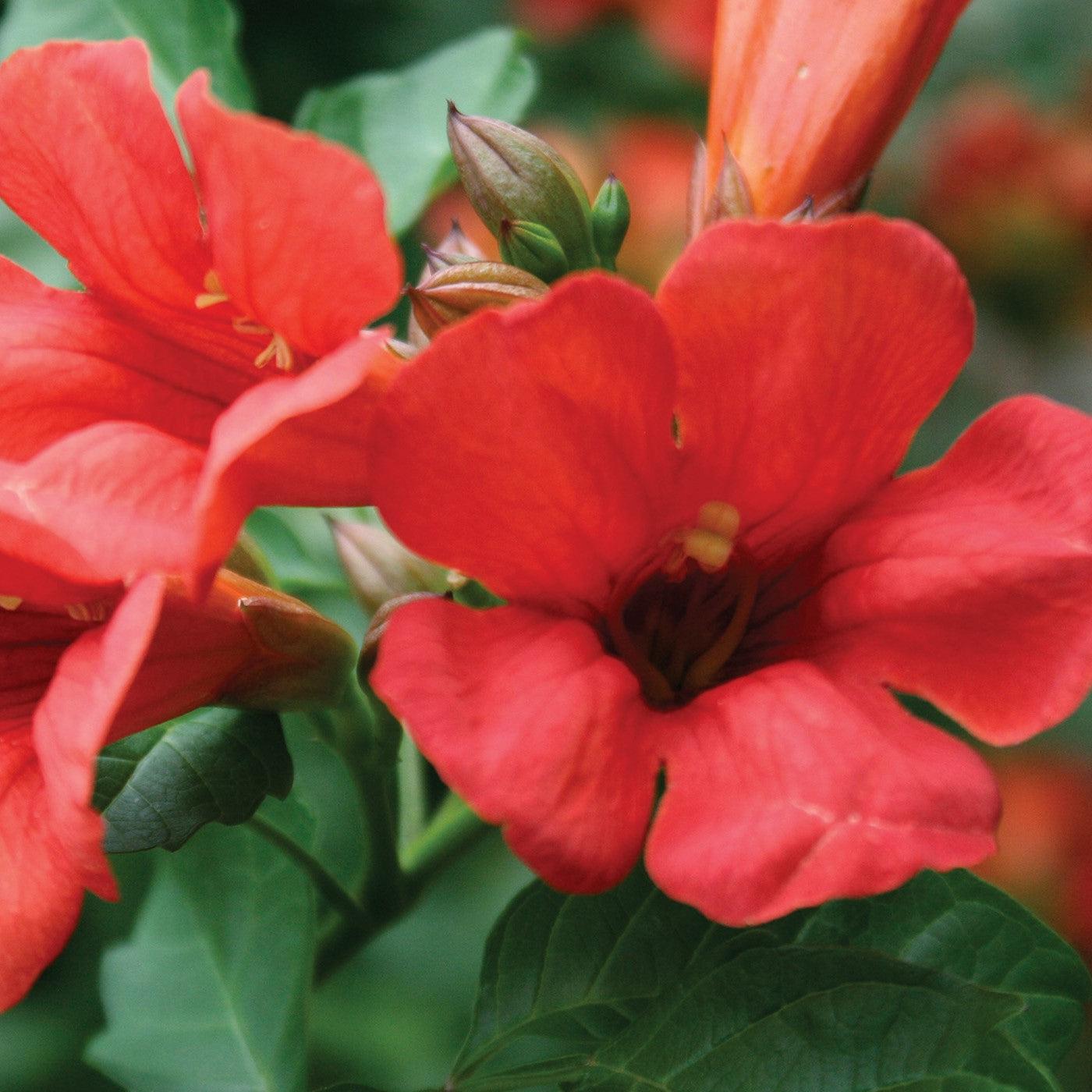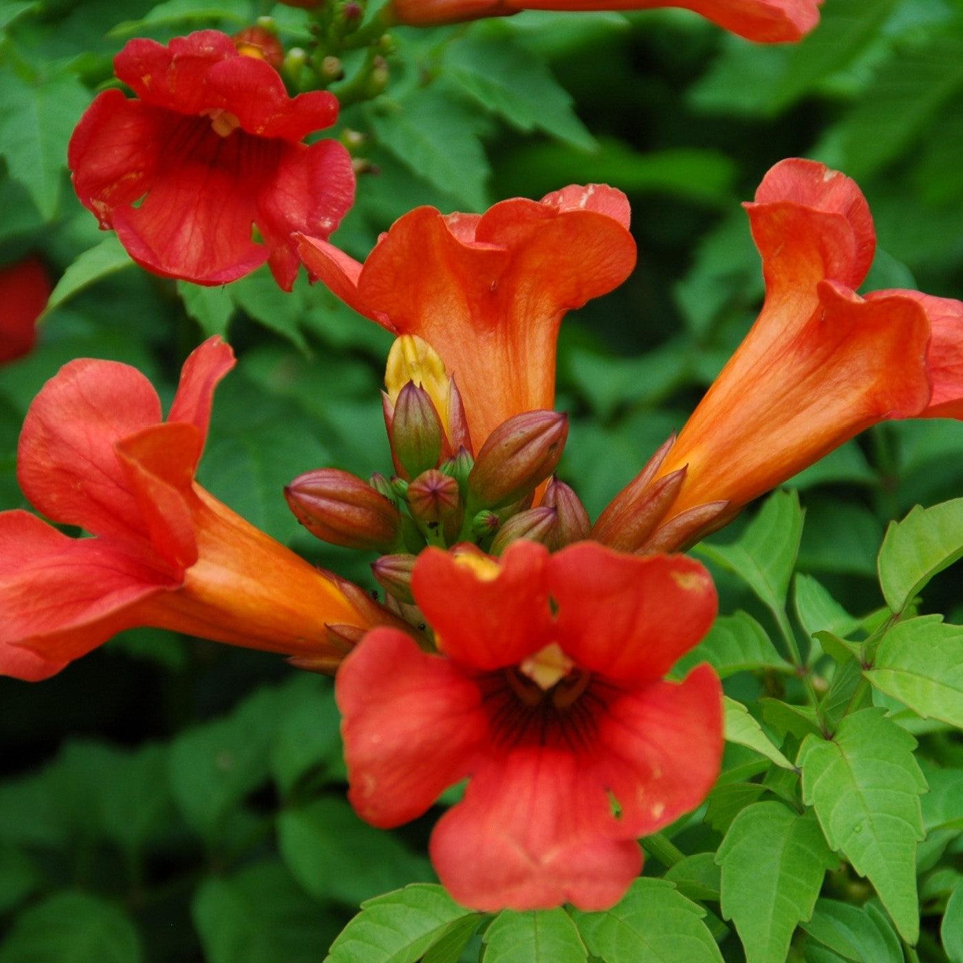 Summer Jazz Fire Campsis is a controlled climbing vine with pinnate glossy, rich green leaves and sports orange-red trumpet-shaped flowers with black throats from midspring into late fall attracting bees and butterflies. Blooms best in full sun and well-drained soil. An excellent choice for trellises or pergolas. The Summer Jazz collection is a tamed series with high resistance to root rot, leaf spot and scorch, and powdery mildew!
