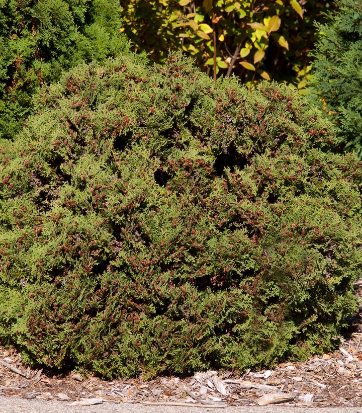 Scale-like foliage populates fan-like foliage fronds that pack tightly to form a dense, flattened globe shaped evergreen offering great landscape texture on a slow growing plant Easy to grow. Perfect for use in smaller landscape spots or in group border plantings. Excellent landscape texture. Slow growing