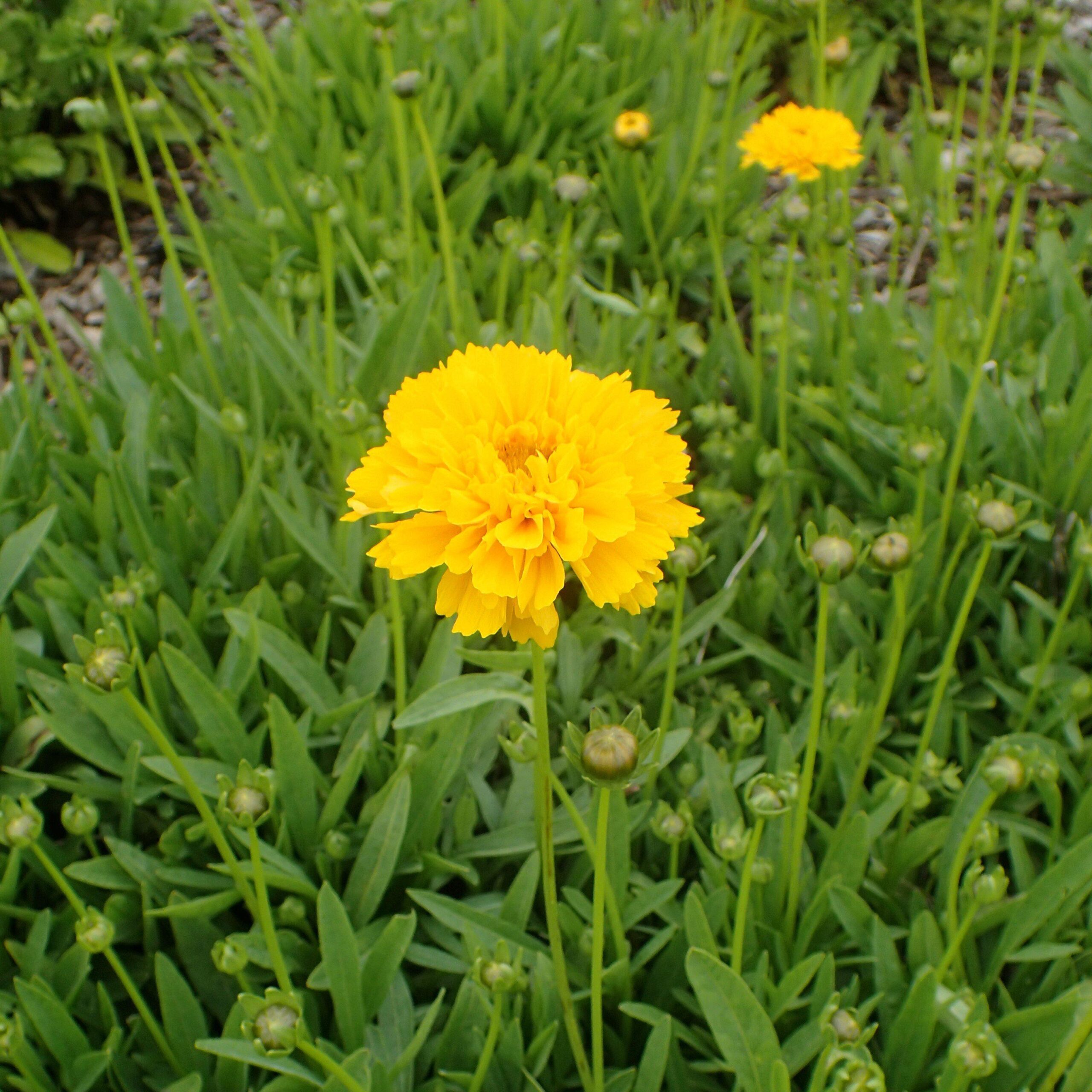Early Sunrise Giant Tickseed is a mounding native perennial with narrow deep green foliage that is pinnate at the top and linear at the base. Semi-double daisy-like yellow flowers with darker yellow centers bloom from late spring into summer. Prompt deadheading can prevent spread and encourage additional bloom in fall. Prefers full sun and dry to medium well-drained soil. Drought, humidity, and road salt tolerance. Tolerates afternoon shade in hot summer climates.