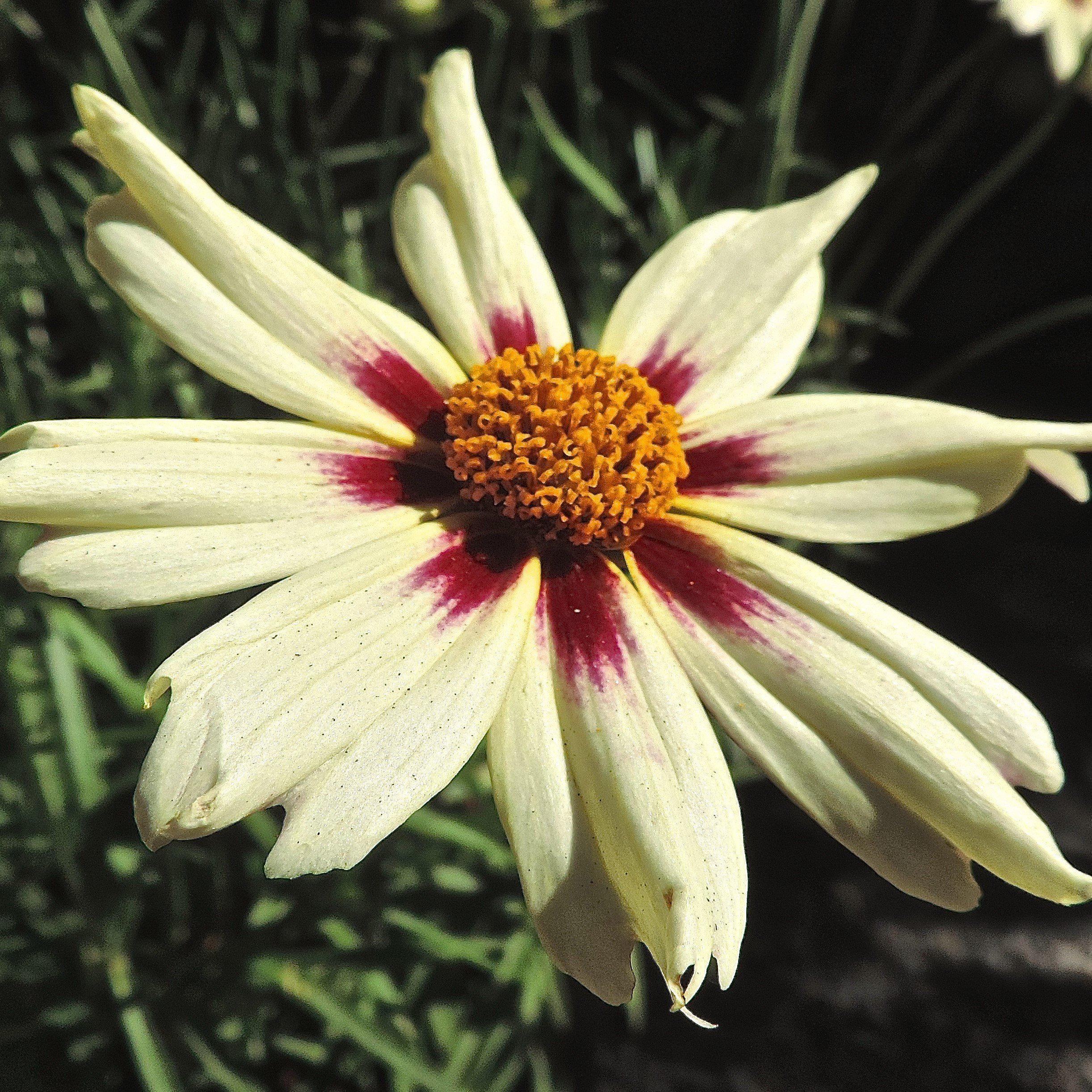 Starlight Coreopsis is a tidy upright clumping perennial with narrow medium green foliage. Its large daisy-like flowers start white with burgundy eyes and dark yellow disks and earn yellow tints with extended burgundy as the weather cools. The flowers bloom continuously from summer into fall. Prefers full sun and dry to medium well-drained soil. Drought, humidity, and road salt tolerance. Slight mildew resistance.