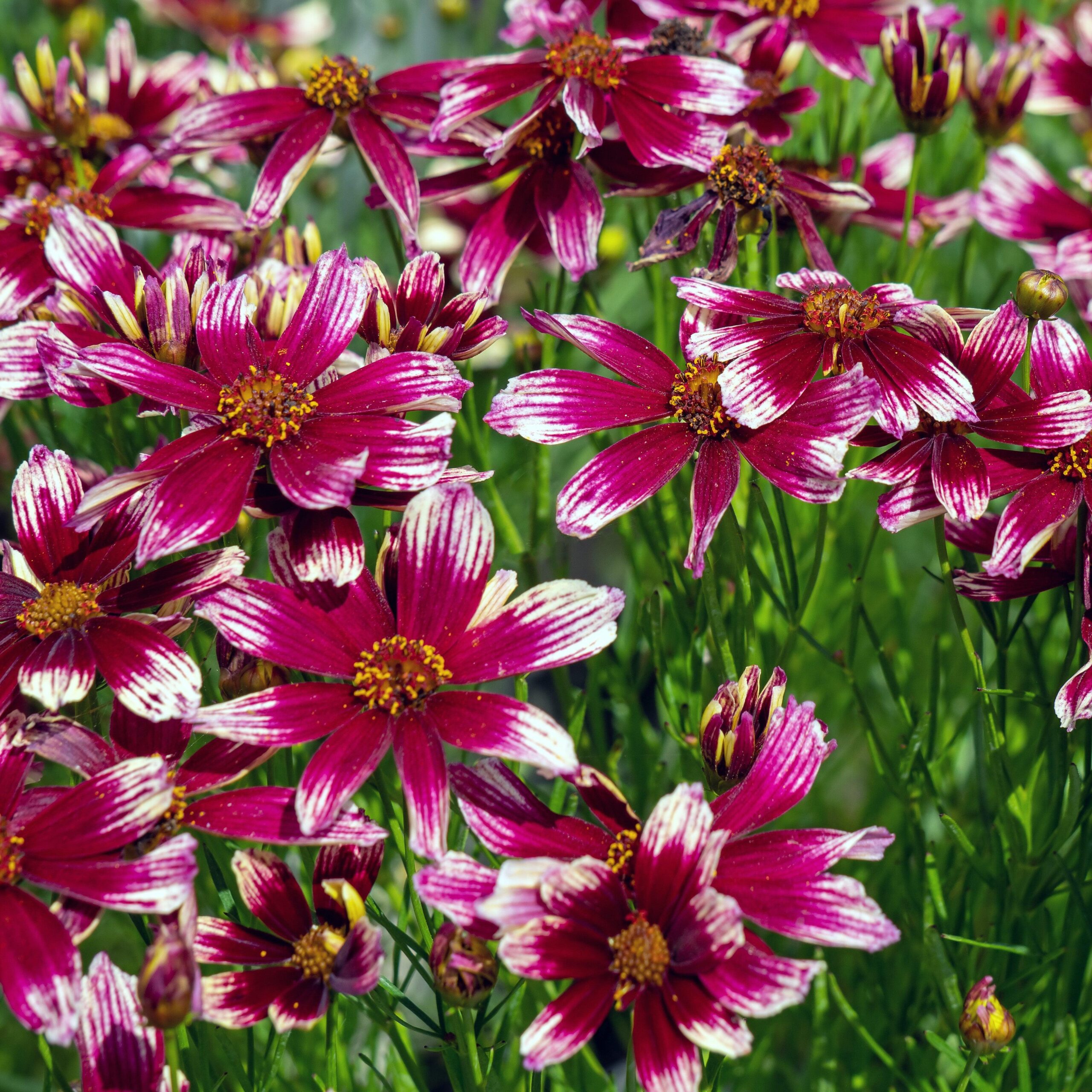 Starstruck Coreopsis is a tidy upright clumping perennial with narrow medium green foliage. Its large daisy-like flowers are a rich magenta that lightens as it reaches the edges to white white yellow disks bloom continuously from mid summer to mid fall. Prefers full sun and dry to medium well-drained soil. Drought, humidity, and road salt tolerance. Slight mildew resistance.