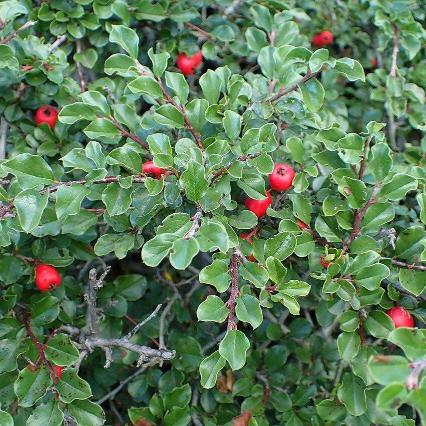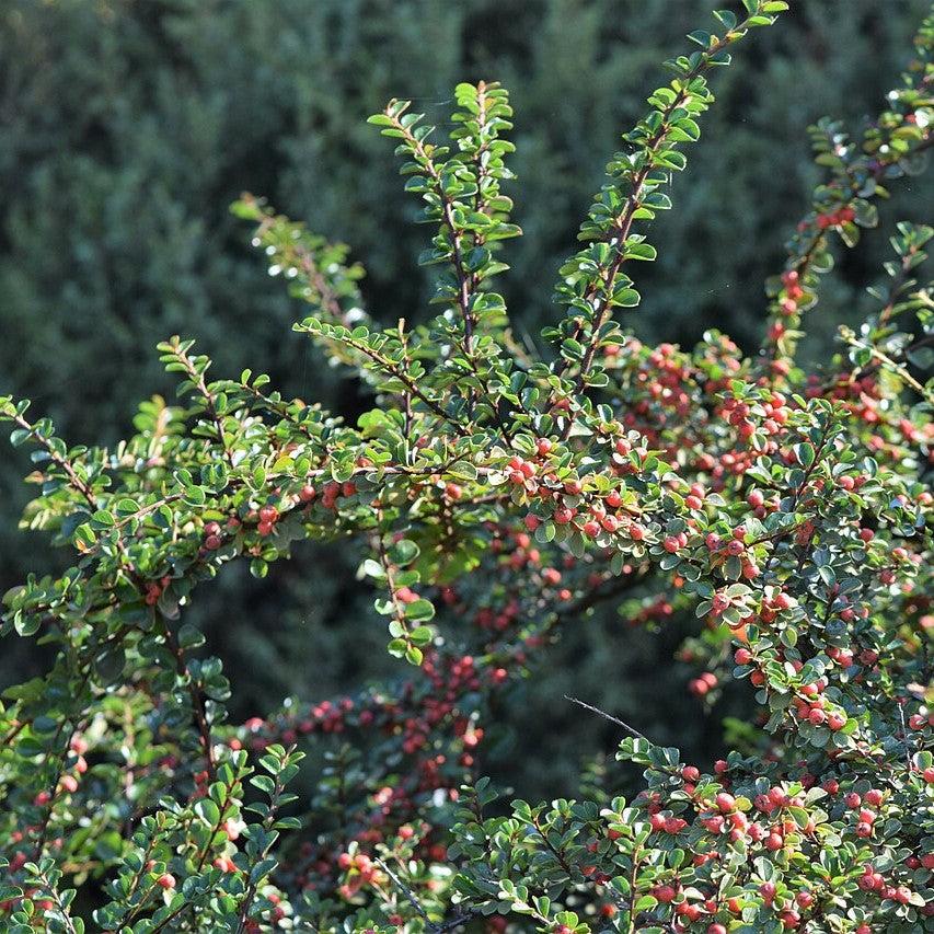 Cranberry Cotoneaster is a dense deciduous shrub with a broad mounded habit and stiffly arching branches that is primarily grown for its attractive fruit. The rounded glossy green willow-like leaves turn shades of purple, red, and bronze in fall. White flowers bloom in late spring, which then give way to shiny red berries. Prefers full sun and moist, well-drained soil. Drought and urban tolerant once established.