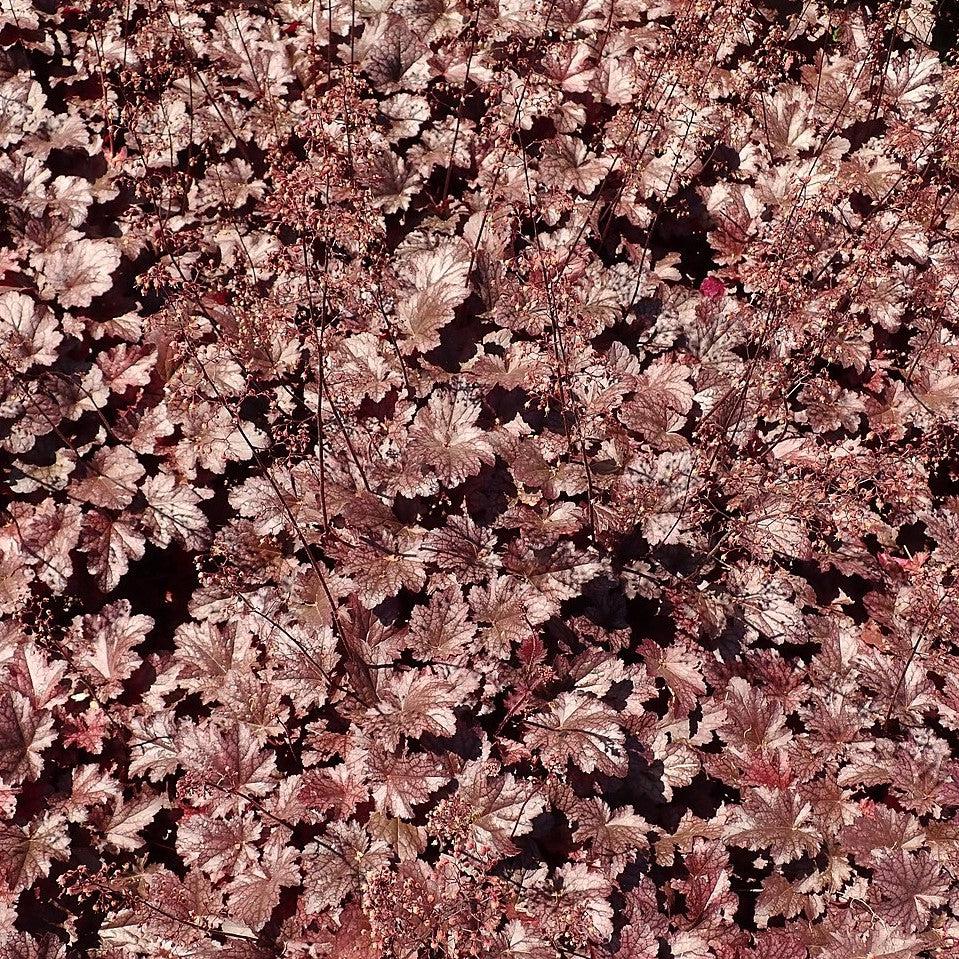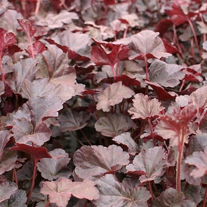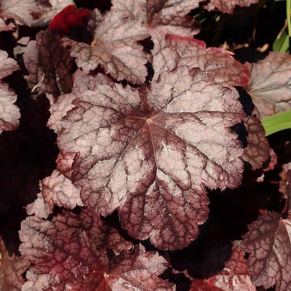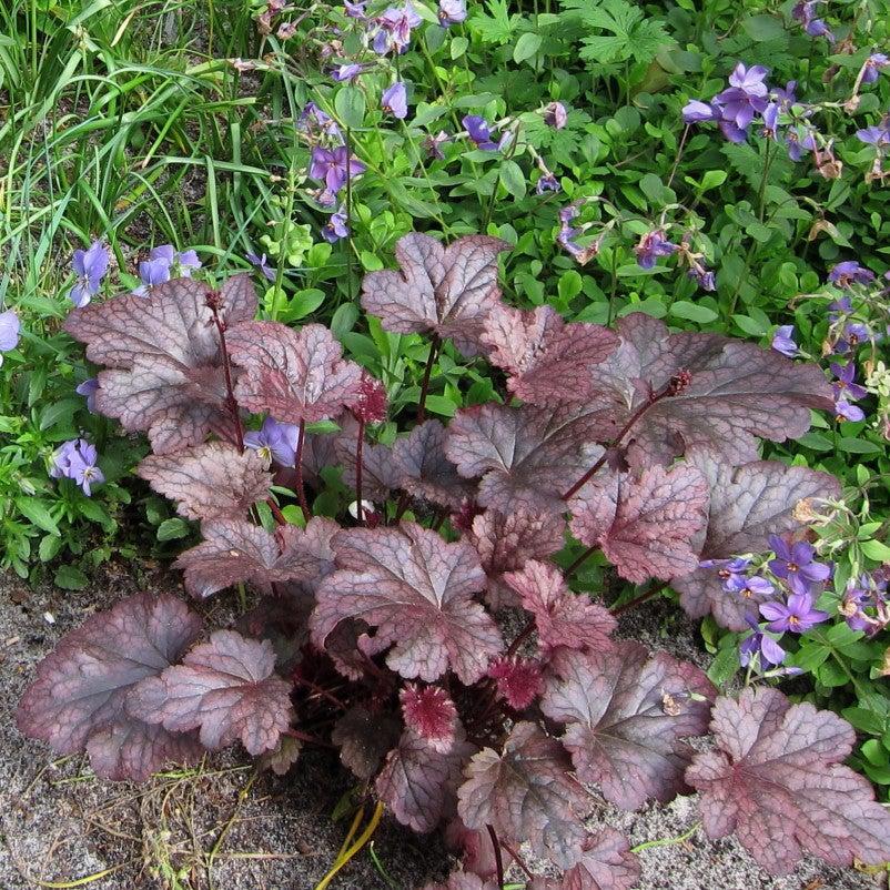 Plum Pudding Coral Bells is an evergreen herbaceous perennial with a clumping habit. It large shiny plum-purple leaves with dark purple veining and rounded lobed create a basal mound that holds its color year round. Tiny white bell-like flowers bloom high on spires in mid-summer attracting butterflies. Best bloom in partial sun and moist well-drained soils.