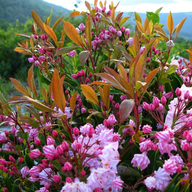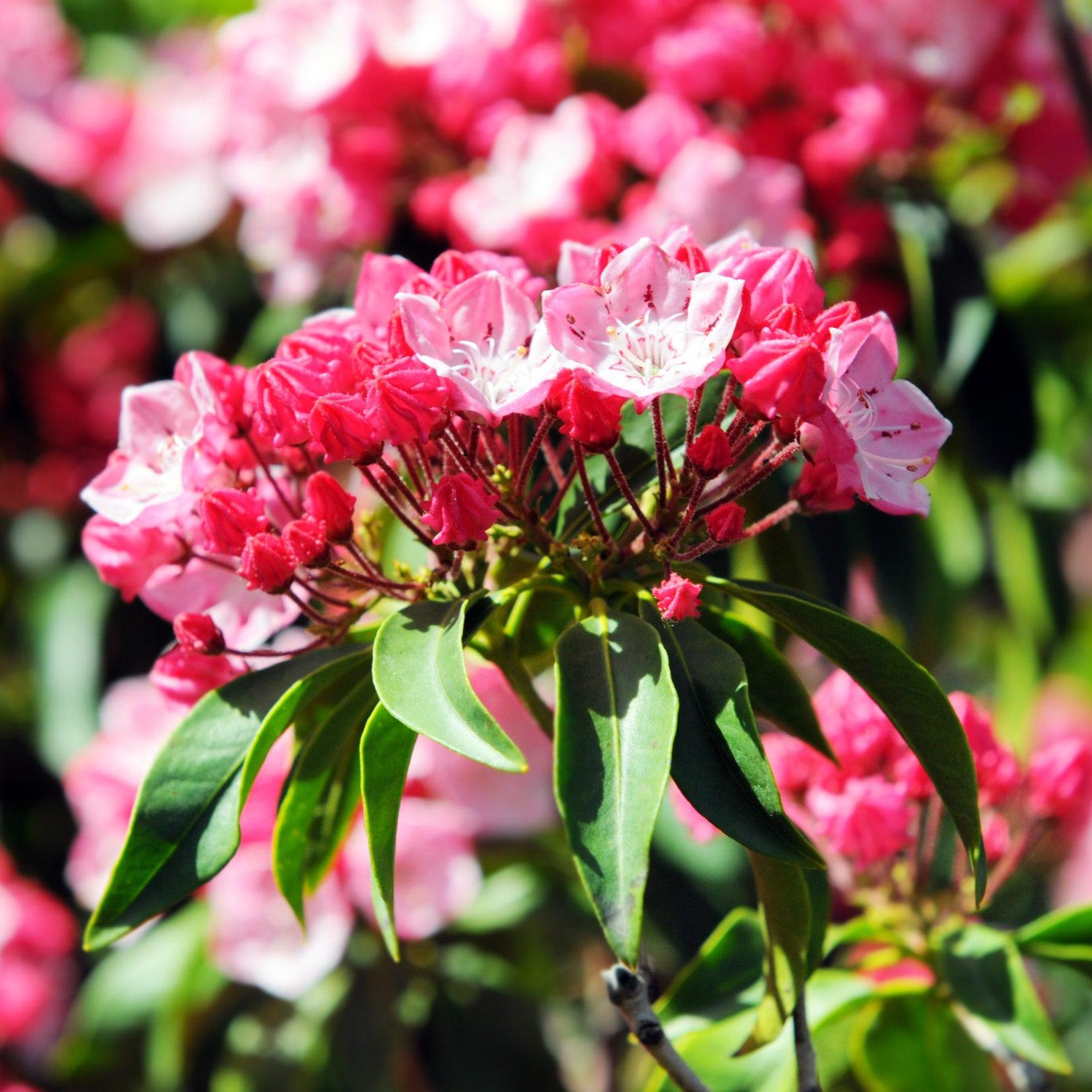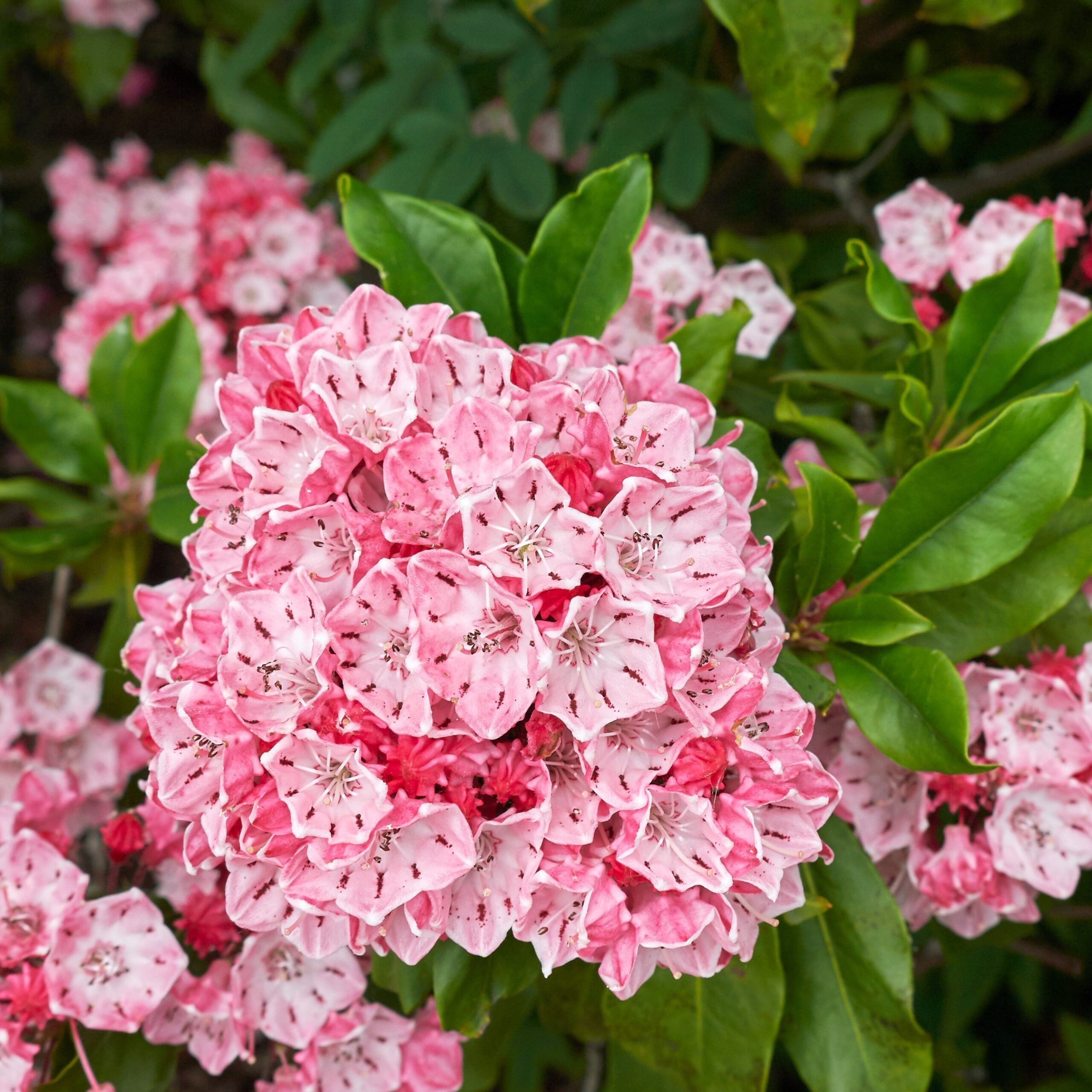 Nipmuck Mountain Laurel is a compact evergreen shrub that forms a dense upright mound of glossy green foliage. Showy clusters of red buds open to pale pink cup-shaped flowers with red inner markings that bloom from late spring into summer. Flowers best with part shade and rich, moist, well-drained acidic soils.