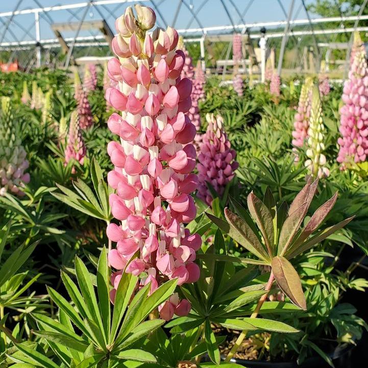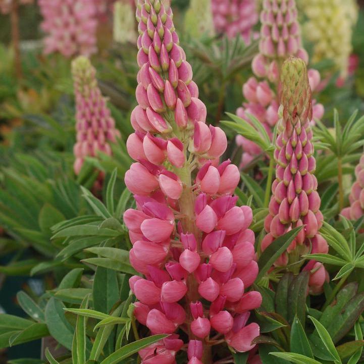 Gallery Pink Lupine is a dwarf herbaceous perennial with a basal mound of narrow palmate foliage. Tightly packed spires rise above the foliage sporting large rich pink sweet-pea like flowers that bloom from late spring through summer. Flowers best in full sun and rich, moist, well-drained soils. Gallery pink is mildew resistant and resistant to deer and rabbits.