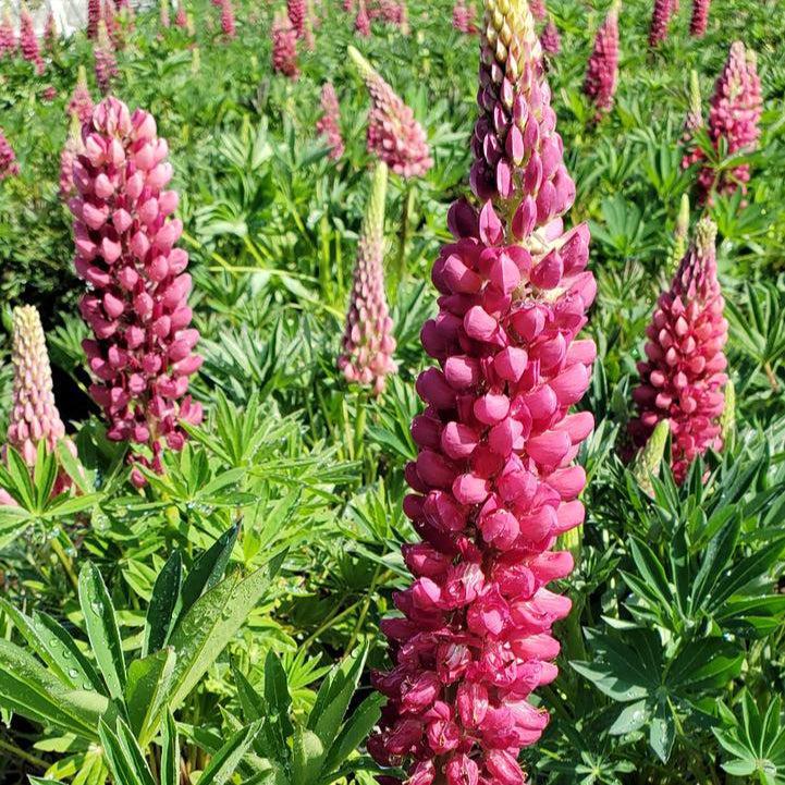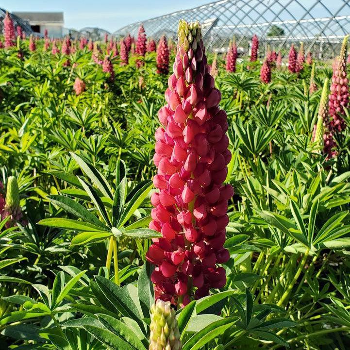 Gallery Red Lupine is a dwarf herbaceous perennial with a basal mound of narrow palmate foliage. Tightly packed spires rise above the foliage sporting large rich red sweet-pea like flowers that bloom from late spring through summer. Flowers best in full sun and rich, moist, well-drained soils. Gallery Red is mildew resistant and resistant to deer and rabbits.