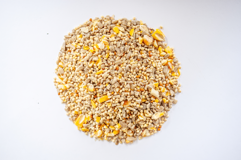 A superior blend of sunflower meats, millets, peanut pieces and cracked corn that will have no mess and no waste. Every size and color of bird will enjoy this blend of all sizes of seed.