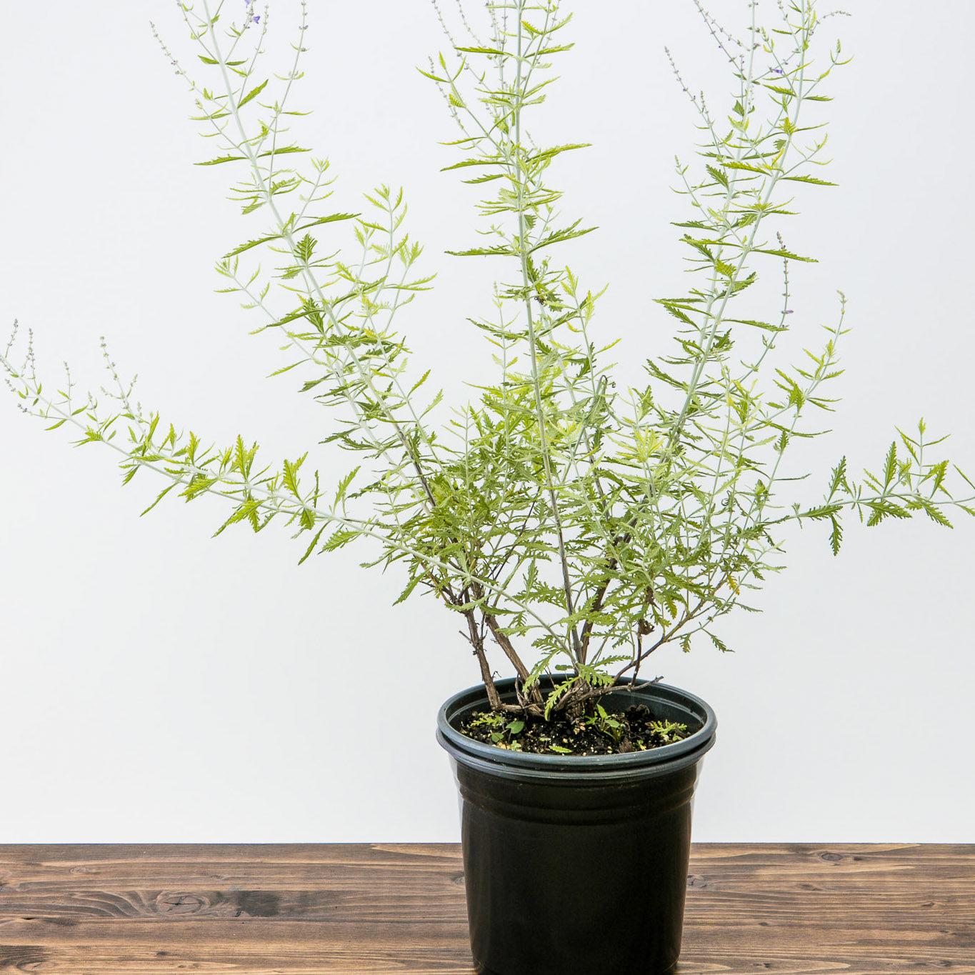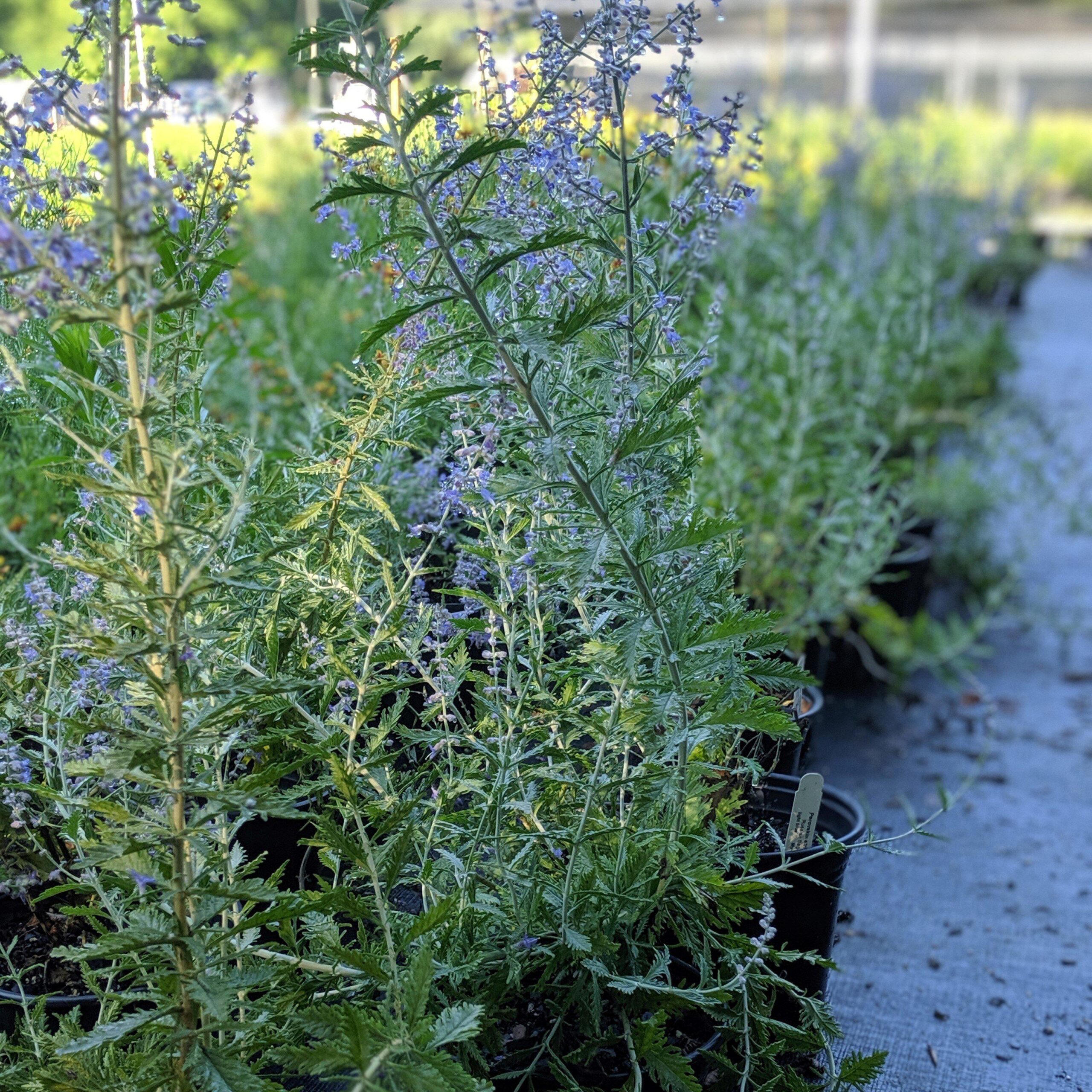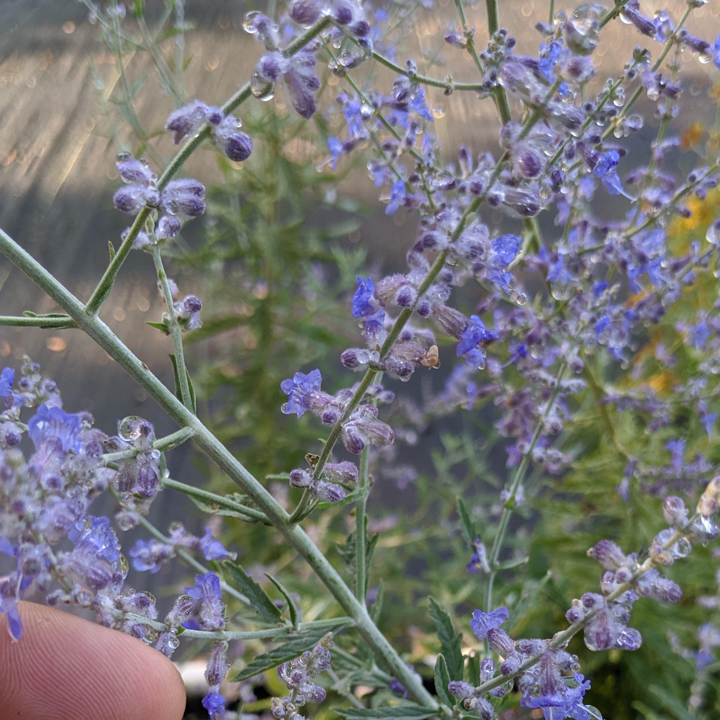 Russian Sage is a woody perennial with fine aromatic grey-green foliage. Whorls of pale blue flowers on airy pinnacles cover the foliage from summer into fall. Best flowering in full sun and well-drained soils. Drought tolerant once established. DO NOT eat the leaves- they are mildly toxic, however the flowers are edible and have a peppery flavor.