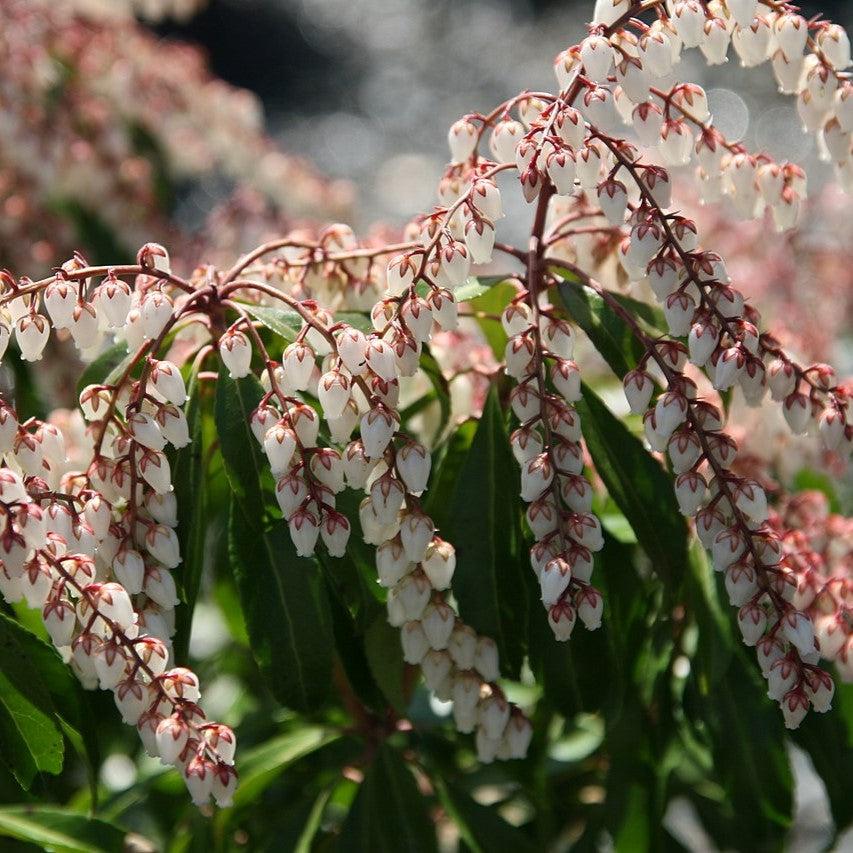 Dorothy Wyckoff Andromeda is a compact evergreen shrub with glossy deep green foliage that emerge red and may return to red in cold winters. The drooping clusters of white bell-shaped flowers with brassy pink calyx and stems that gradually fade to green as they bloom in spring. Best bloom in part sun with slightly acidic and moist well-drained soils.