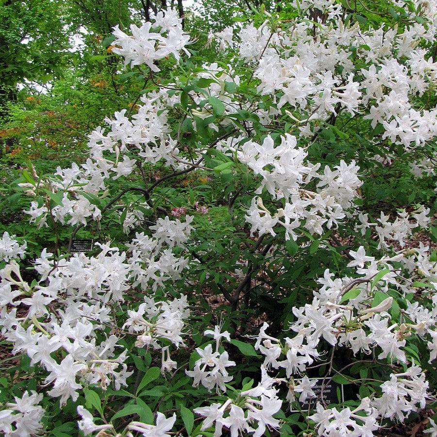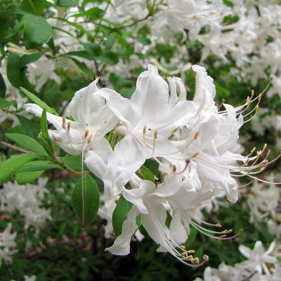 Swamp Azalea is a loosely upright native shrub that can be deciduous or evergreen with simple green leaves that turn red in fall if deciduous. The very fragrant, sticky white flowers bloom from late spring into summer. Deadheading spent flowers can extend the bloom season. Best grown in part sun and rich, moist to wet well-drained acidic soils.