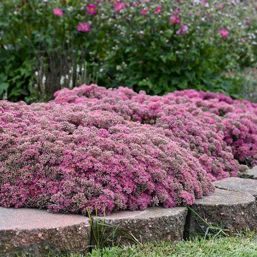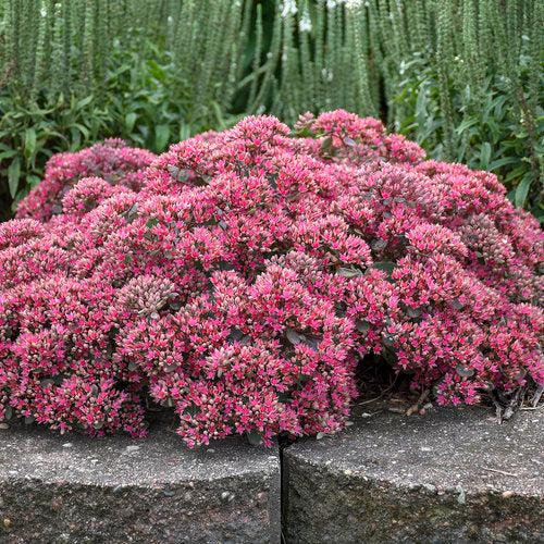 Popstar Stonecrop is a low mounding semi-evergreen succulent with whorls of fleshy light blue-green foliage. Dense clusters of tiny salmon pink star-shaped flowers followed by deep pink seedheads top the stems from mid summer into fall. Grows best in full sun and dry to medium well-drained soils. Drought and heat tolerant once established.