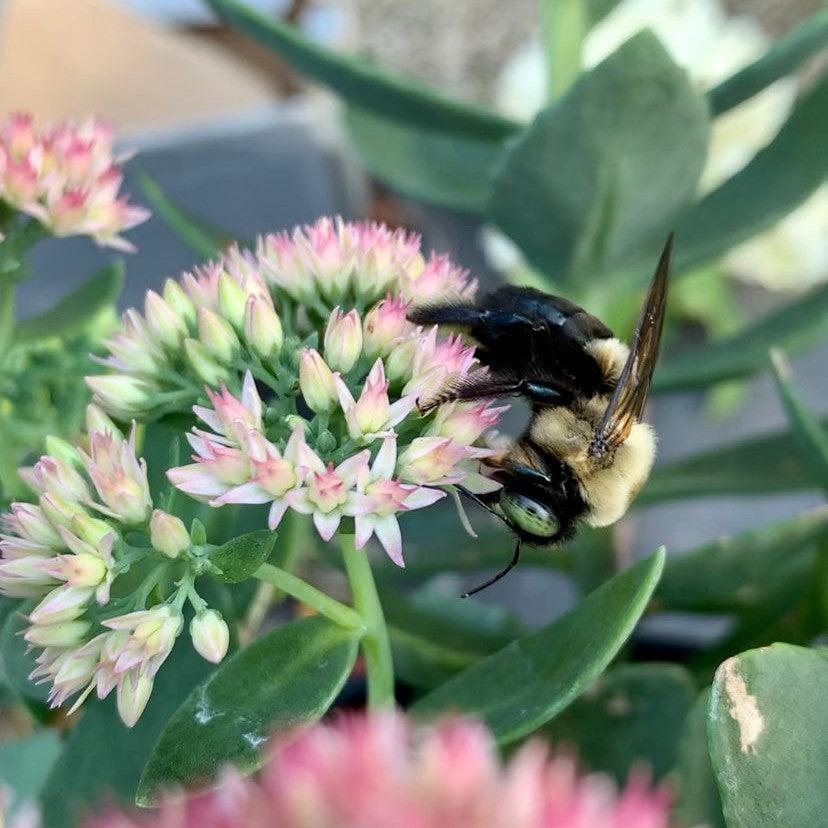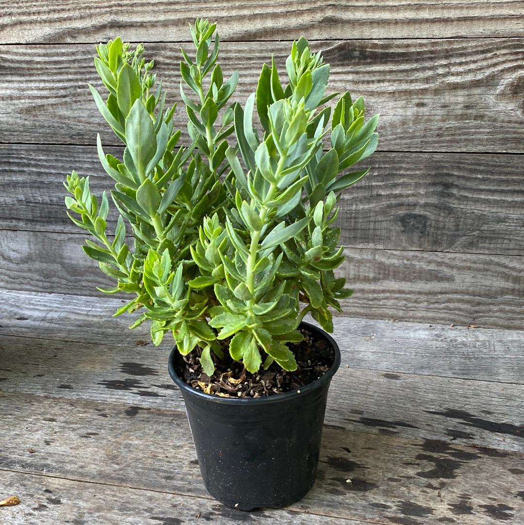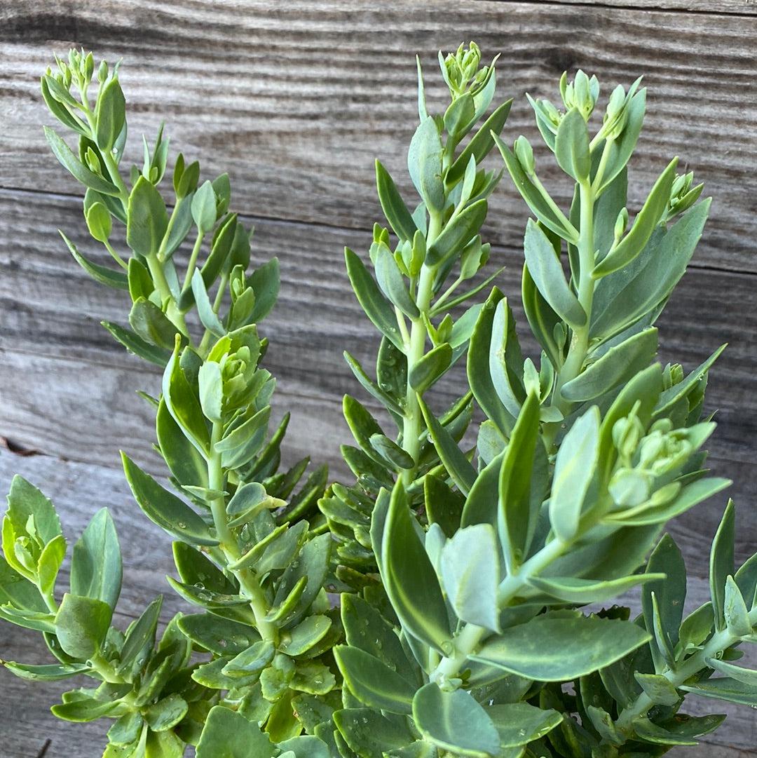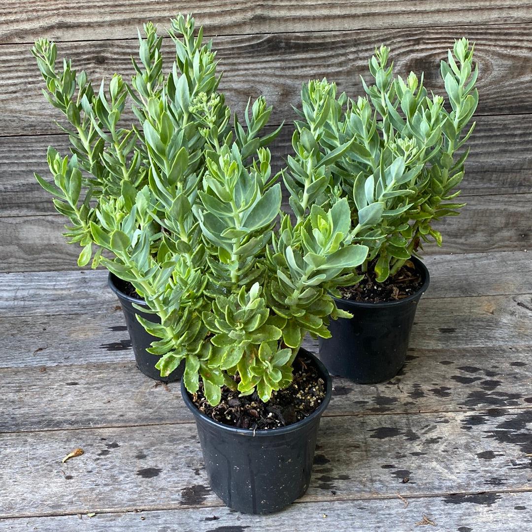Autumn Joy Stonecrop is a tough upright clumping evergreen succulent with large light green scalloped fleshy foliage. Large disk-shaped clusters of small pink star-shaped flowers that mature to russet cover the plant in late summer to fall attracting butterflies. Grows best in full sun and dry to medium well-drained soils. Drought and heat tolerant once established.