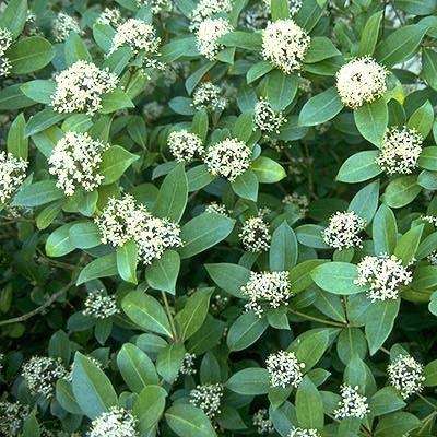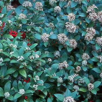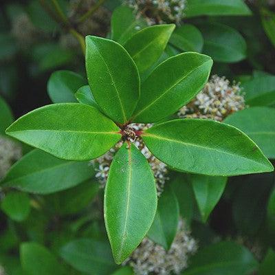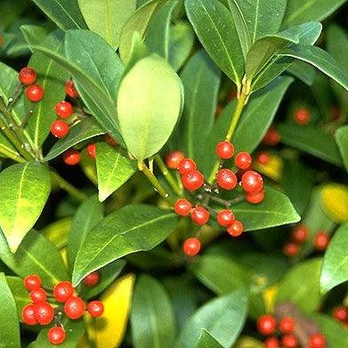 Japanese Skimmia is a small evergreen shrub that has a mounded habit and aromatic whorls of glossy dark green leathery foliage with lighter undersides. The terminal panicles of fragrant creamy white flowers bloom in mid spring. Red berries follow in fall. Grows best in part shade and rich, well drained acidic soils.