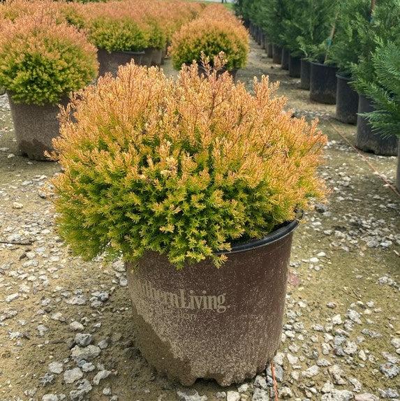 Fire Chief Globe Arborvitae is a slow-growing global dwarf evergreen shrub with bright gold new growth in spring that matures to dark green and deep red fall color. Best grown full sun and well-drained soils. Drought tolerant once established.