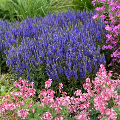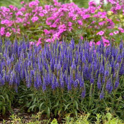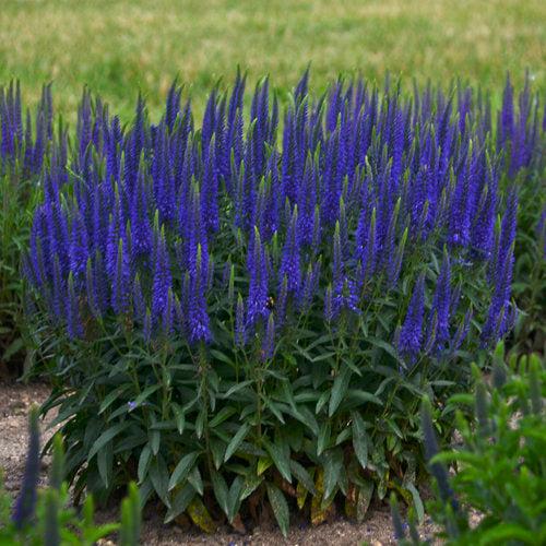 Wizard of Ahhs Veronica is a compact erect herbaceous perennial with tidy narrow lance-like deep green leaves. Thick vertical flower spikes packed with tiny intense violet-blue flowers top the foliage in summer. Grows best in full sun and well-drained soils. Tolerates light shade.